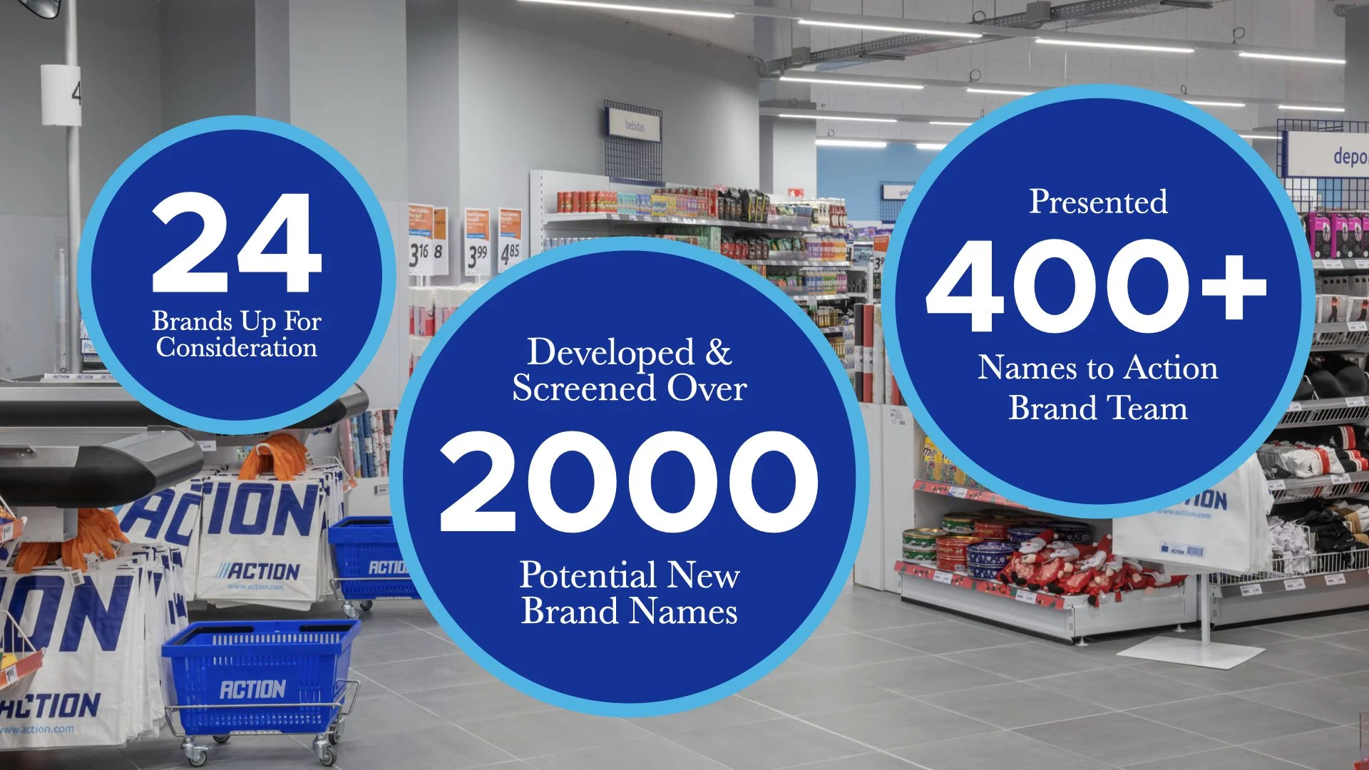 In preparation for their international expansion into the US, officially announced March 2026, Action approached Contrast to aid in evaluating their portfolio of over 70 owned brands and their respective names to help navigate both potential trademark conflicts with their existing names as well as consider opportunities to pivot existing names to ones that may better resonate with American shoppers versus their current European market.